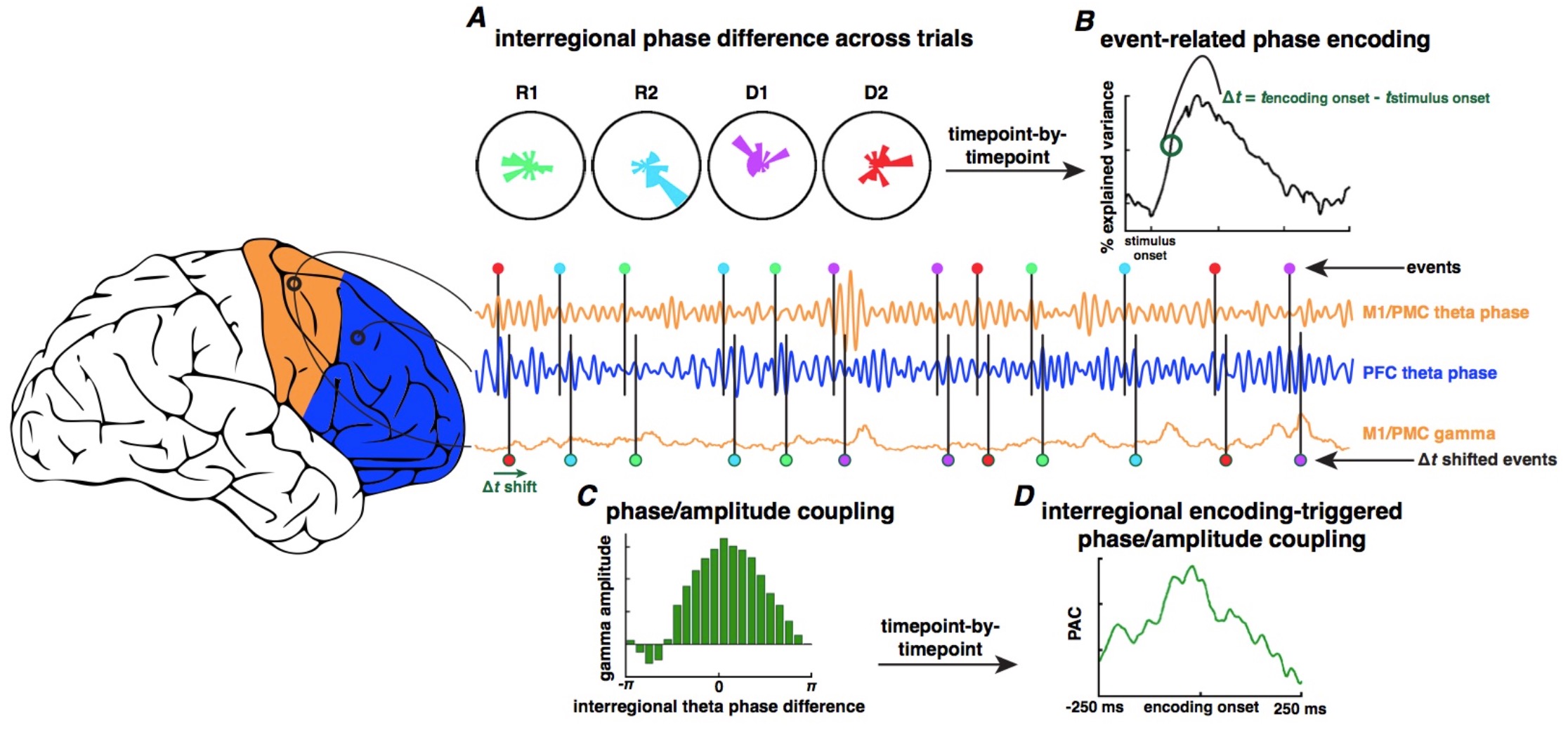 Abstract: Humans have a capacity for hierarchical cognitive control: the ability to simultaneously control immediate actions while holding more abstract goals in mind. Neuropsychological and neuroimaging evidence suggests that hierarchical cognitive control emerges from a frontal architecture whereby prefrontal cortex coordinates neural activity in the motor cortices when abstract rules are needed to govern motor outcomes. Here we utilize the improved temporal resolution of human intracranial electrocorticography to investigate the mechanisms by which frontal cortical oscillatory networks communicate in support of hierarchical cognitive control. Responding according to progressively more abstract rules results in increased prefrontal local neuronal population activity (high gamma amplitude, 80-150 Hz) and greater frontal network theta phase encoding (4-8 Hz) which together predict trial-by-trial response times. Theta phase encoding couples with high gamma amplitude during interregional information encoding, suggesting that interregional phase encoding is a mechanism for the dynamic instantiation of complex cognitive functions by frontal cortical subnetworks. https://www.ncbi.nlm.nih.gov/pubmed/26214371